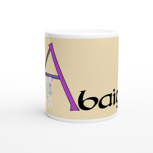 Abaigh (Abbey) - Personalized white ceramic mug with Irish name Abaigh (Lamb Design) (Free Shipping)