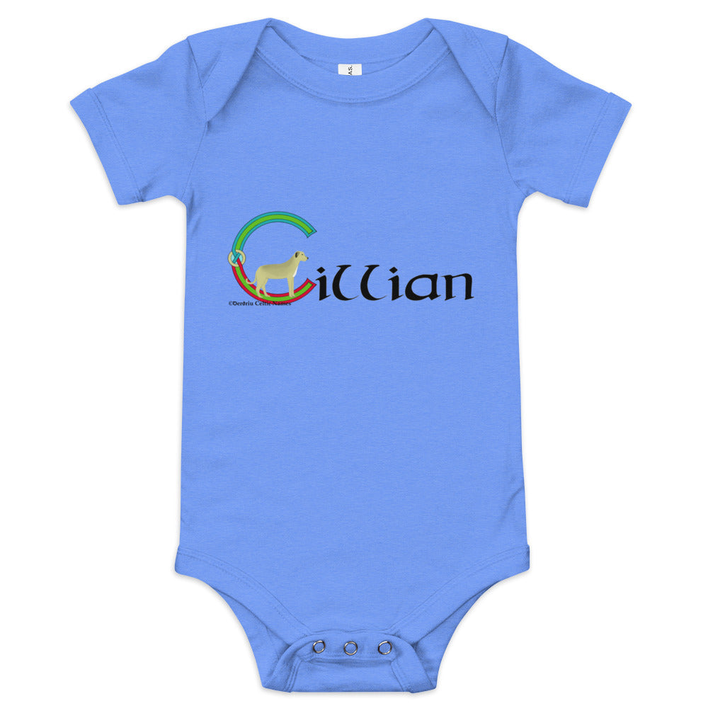 Personalized baby short sleeve one piece with the Irish language name Cillian - a novel Irish gift for a birthday or Christmas.