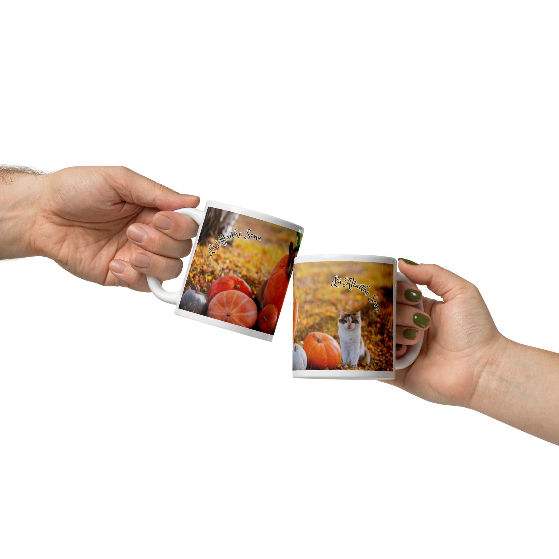 Lá Altaithe Sona (Happy Thanksgiving) Irish Language White Glossy Mug (Dog, Cat and Pumpkin Design)