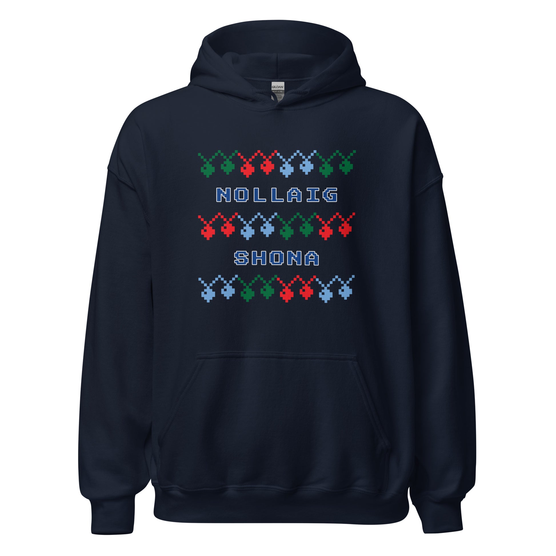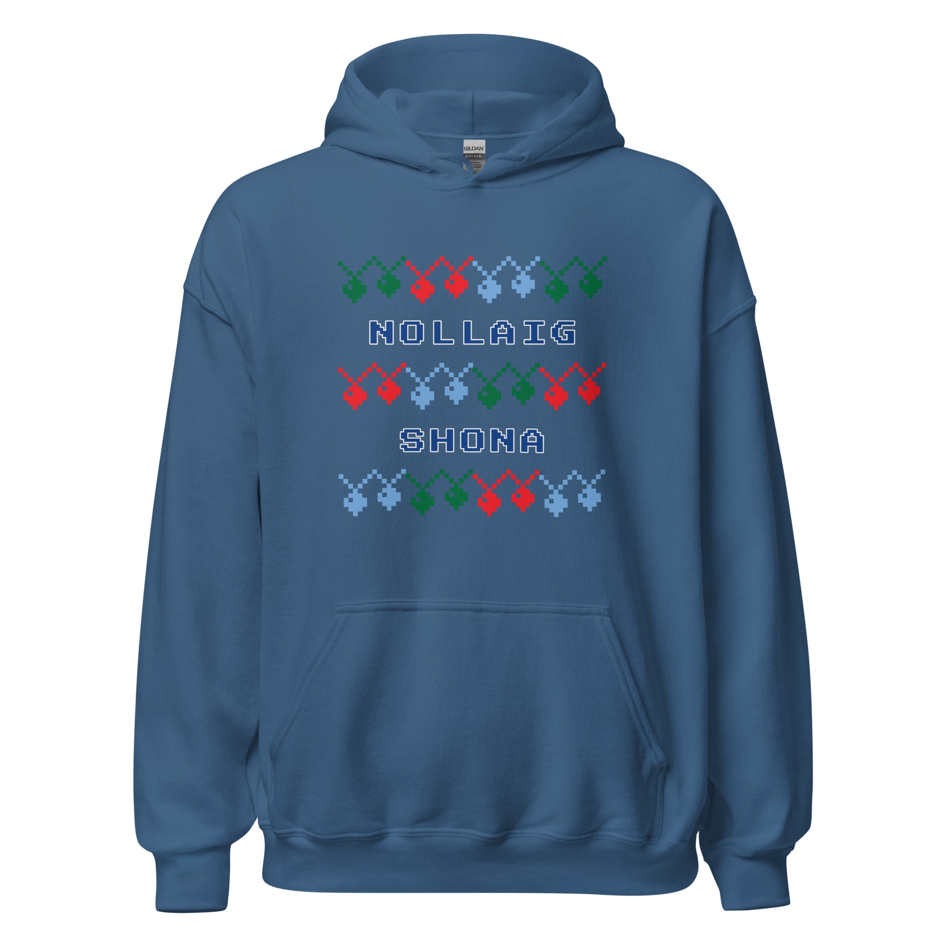 Enjoy Christmas with this unique hoodie, or send as a Christmas gift. "Nollaig Shona" (pronounced "null-ig hunna") means "Happy Christmas" in Irish. This has hoodie has a retro design reminiscent of old-fashioned Christmas sweaters/jumpers.