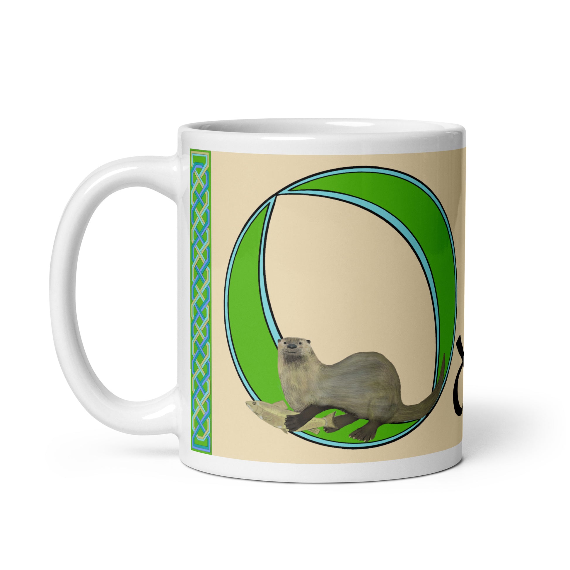 The letter O is decorated with an otter (madra uisce, in Irish, which literally means water-dog) holding a fish (iasc). Another Irish name for otter is dobharchú (water-hound) which is synonymous with the legendary King Otter of Irish folklore, which was considered to be like both a dog and an otter, or alternatively half fish and half dog.